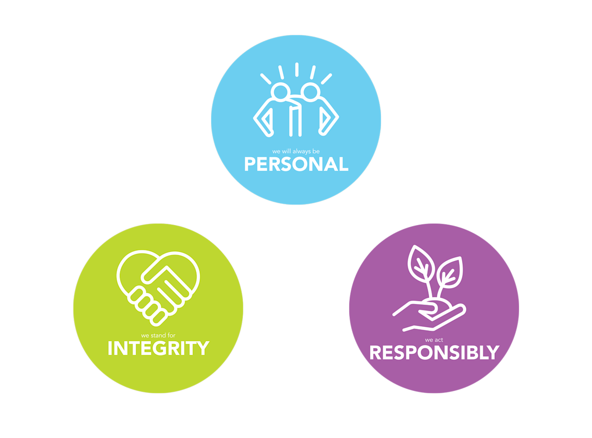 In alles wat we doen blijven we integer, handelen we verantwoordelijk en zijn we altijd persoonlijk.